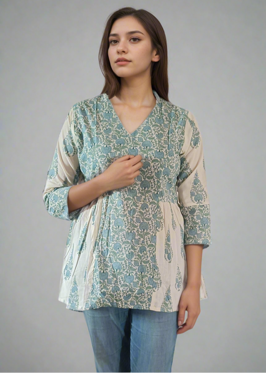 VINTAGE GARDEN BLOCK PRINT COTTON PEPLUM TUNIC KURTI TOP