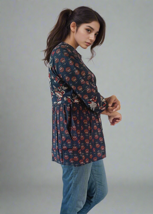 BOLD BLOOM ON INDIGO COTTON PEPLUM TUNIC KURTI TOP