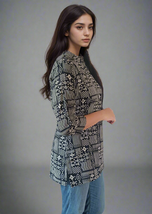BLACK TRIBAL PRINT COTTON TUNIC KURTI TOP